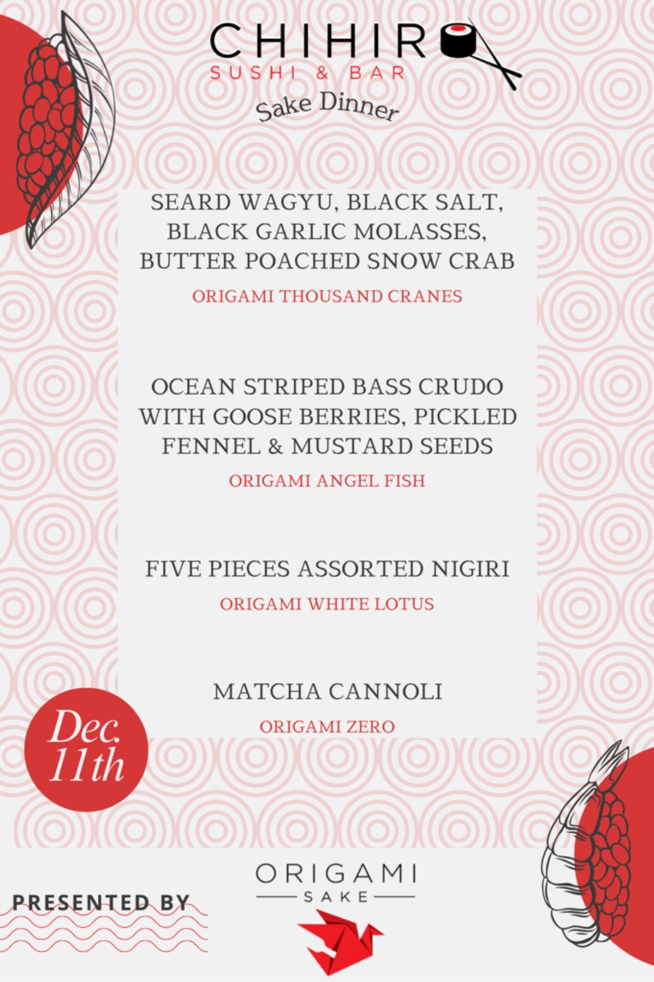 4 courses paired with 4 different sakes for $100 plus tax and tips. Dec. 11 6:30PM.